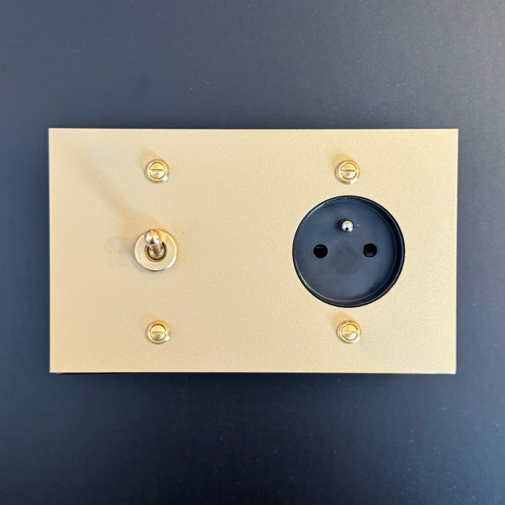 Interrupteur industriel à levier laiton, fonction simple ou va-et-vient, unipolaire 240V/15A, corps polyester, connexion par cosses à vis isolée par gaine thermorétractable. Prise électrique avec terre, 240V/16A, connexion par bornier automatique double pour faciliter le pontage de prise à prise, sécurité enfant.