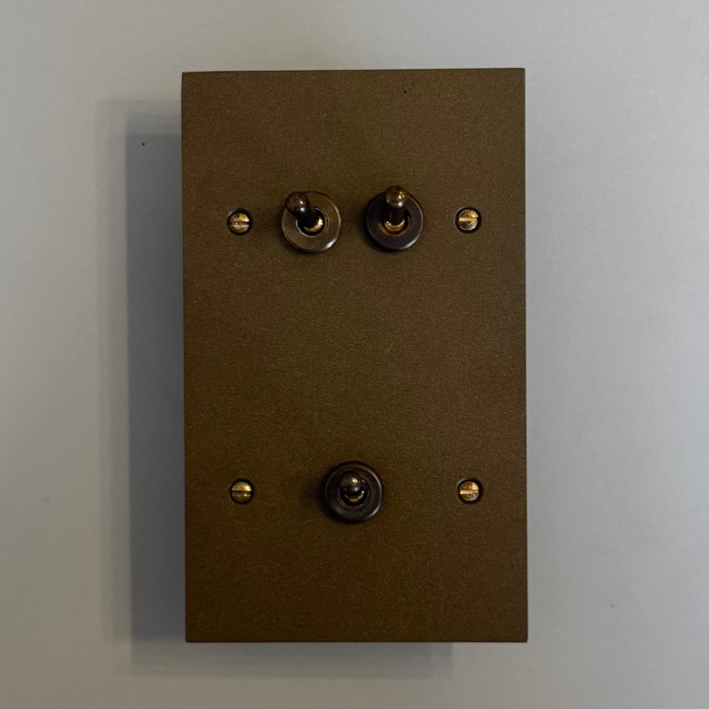 Interrupteur industriel à levier bronze, fonction simple ou va-et-vient, unipolaire 240V/15A, corps polyester, connexion par cosses à vis isolée par gaine thermorétractable.