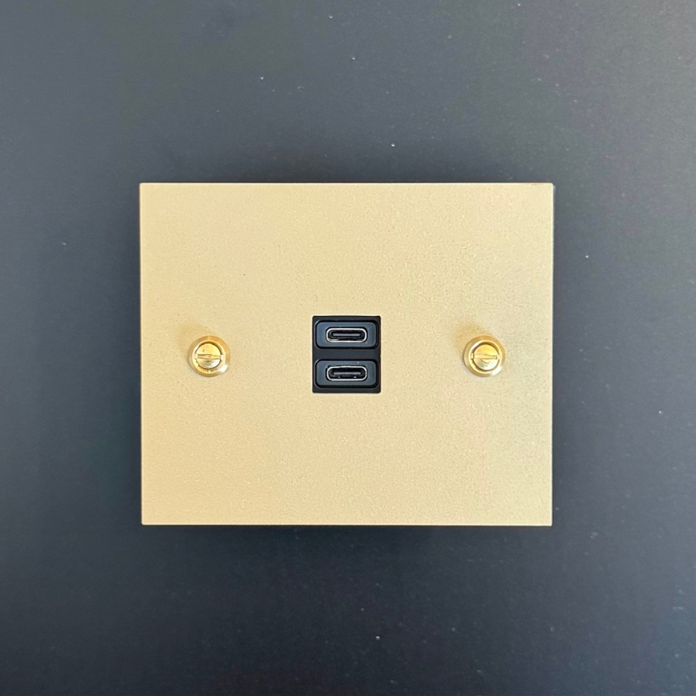 Prise chargeur pour 2 usbC. Fabriqué en France. Plaque acier époxy or mat, dim 75x90mm, épaisseur 6mm.